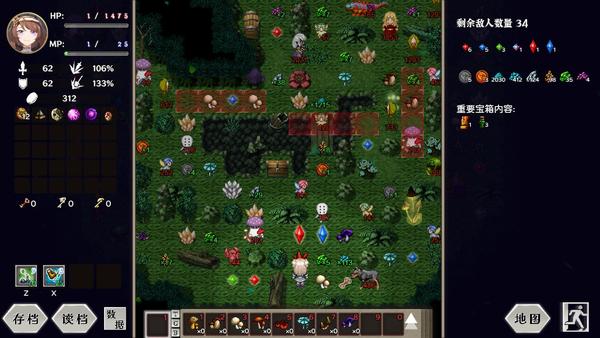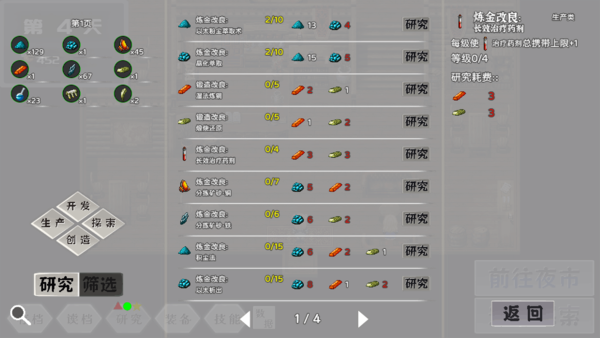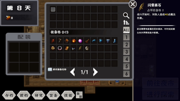 游戏在传统魔塔框架上加入了“天数”机制。每一天都由【炼金】、【研究】和【探索】三个阶段组成:炼金用于将探索所得转化为更高阶的资源;研究则能拓展生产与战斗的可能性;而探索则是魔塔式的核心玩法,但可以在获取关键物品或者搜刮到足够资源后随时撤退,第二天再来挑战,不必一味追求通关。